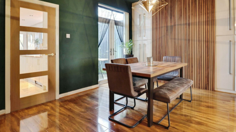 "The dining room offers floor-to-ceiling built-in storage, access to a useful understairs storage room, and patio doors opening onto the rear garden.