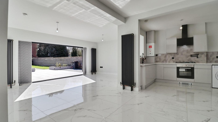"The rear extension creates a spacious open-plan kitchen, dining, and living area, flooded with natural light and opening onto the garden through bi-fold doors.