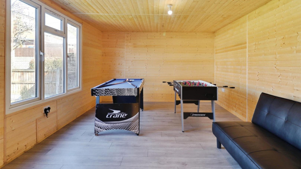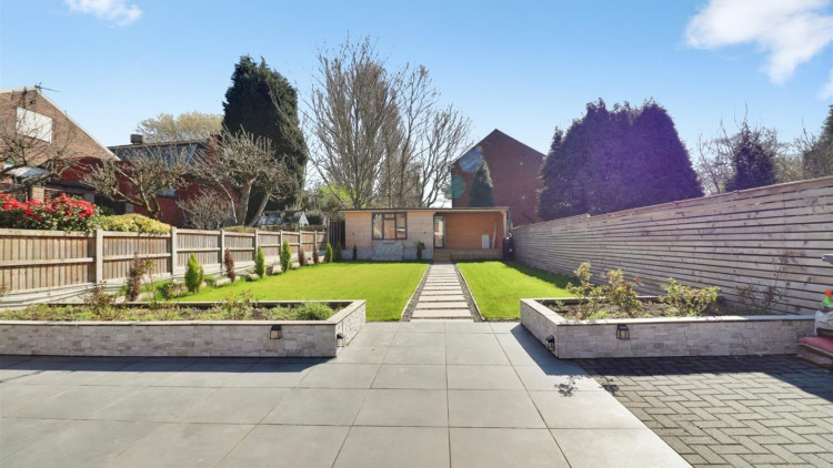 "The rear garden is generous, with a large patio, lawn, water feature, two raised beds, and a versatile outbuilding at the bottom of the garden with electrics and a decked seating area, offering the perfect space for entertaining.