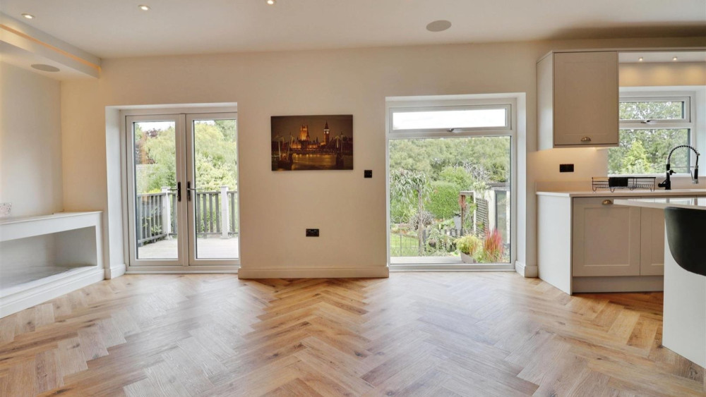 "At the heart of the property lies a bright and inviting open-plan kitchen, dining and living area, where French doors lead out onto a decked terrace, a patio, and a beautifully maintained lawn.