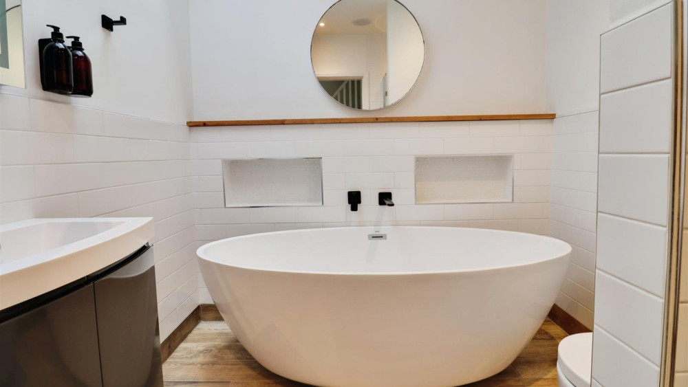 "The ground floor offers three well-proportioned bedrooms, one of which enjoys fitted wardrobes and a private ensuite, while a stylish family bathroom with underfloor heating serves the rest of the home.