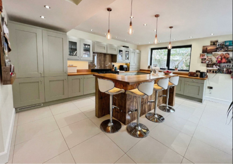 "The breakfast bar and island create an inviting space for casual dining, while sliding doors seamlessly connect the interior to the stunning rear garden.
