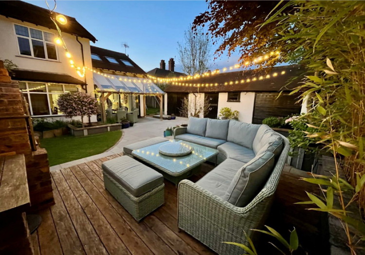 "The beautiful garden wraps around the property, showcasing well-maintained lawns, patio areas, and a bespoke brick-built barbecue oven, along with a charming pergola/gazebo area, perfect for outdoor entertaining.