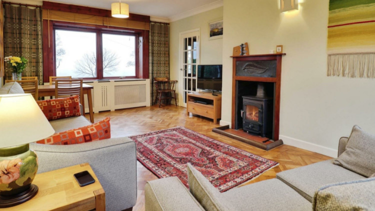 "A log-burning stove forms a warm and characterful focal point, while French doors and a large feature window allow natural light to flood the space and perfectly frame the open countryside views beyond.