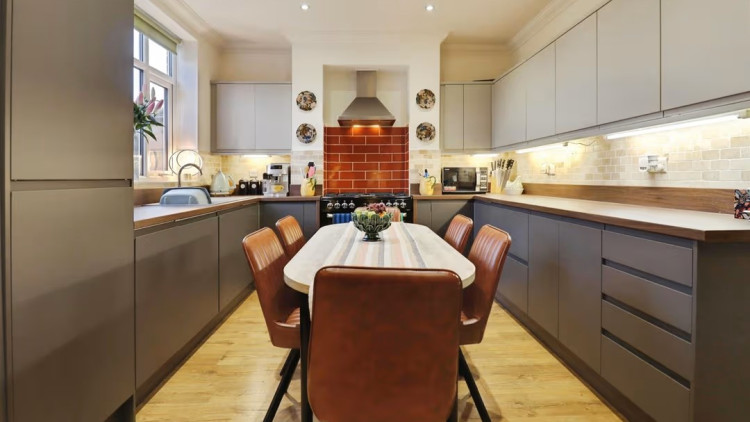 "To the rear is an impressive kitchen dining room forming the heart of the home, offering an abundance of worktop and cupboard space together with ample room for a dining table, ideal for everyday living and entertaining.